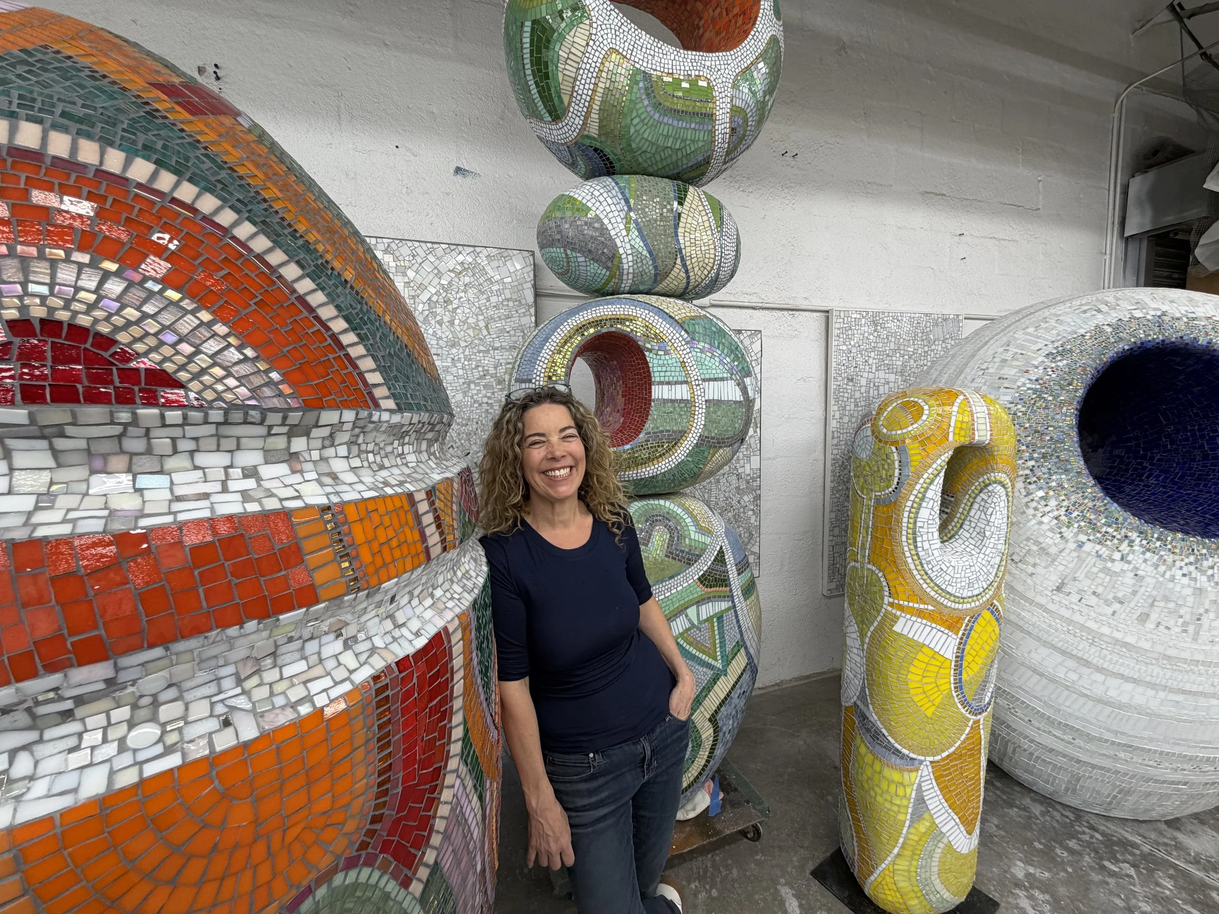 My work consists of sculptures, installations, and murals. I primarily use mosaic glass medium to articulate the energy I am wanting to translate into the physical form. Mosaic is a static medium which I attempt to make feel flowing and soft. This tension is always present in my work and color and line are extremely important to depict this in my visual language.